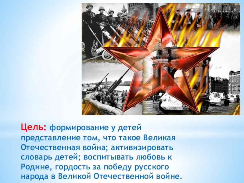 Цель: формирование у детей представление том, что такое Великая Отечественная война; активизировать словарь детей; воспитывать любовь к Родине, гордость за победу русского народа в Великой Отечественной войне.