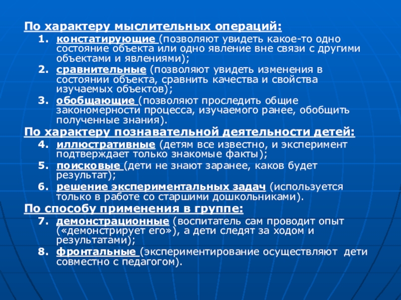 в эксперименте, различают следующие виды опытов…»
