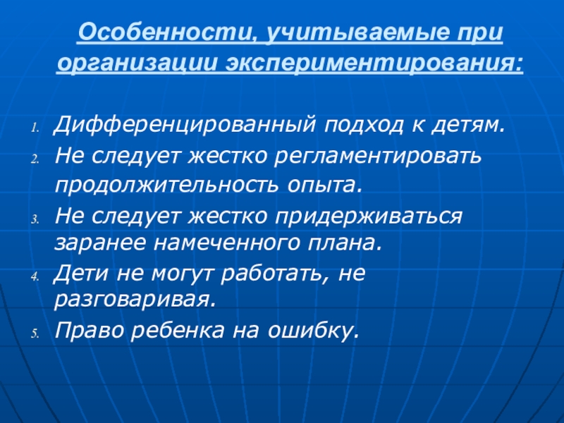 Слайд 24Особенности, учитываемые при организации экспериментирования: