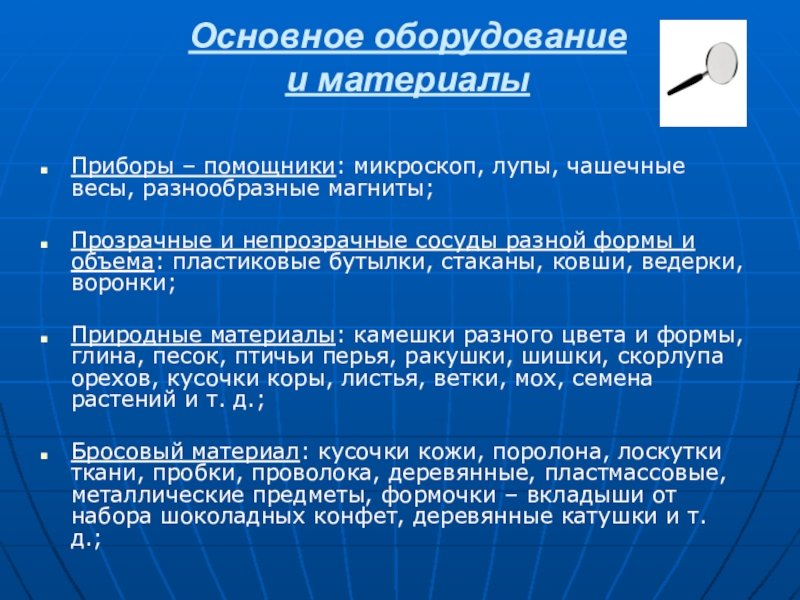 Приборы – помощники: микроскоп, лупы, чашечные весы, разнообразные
