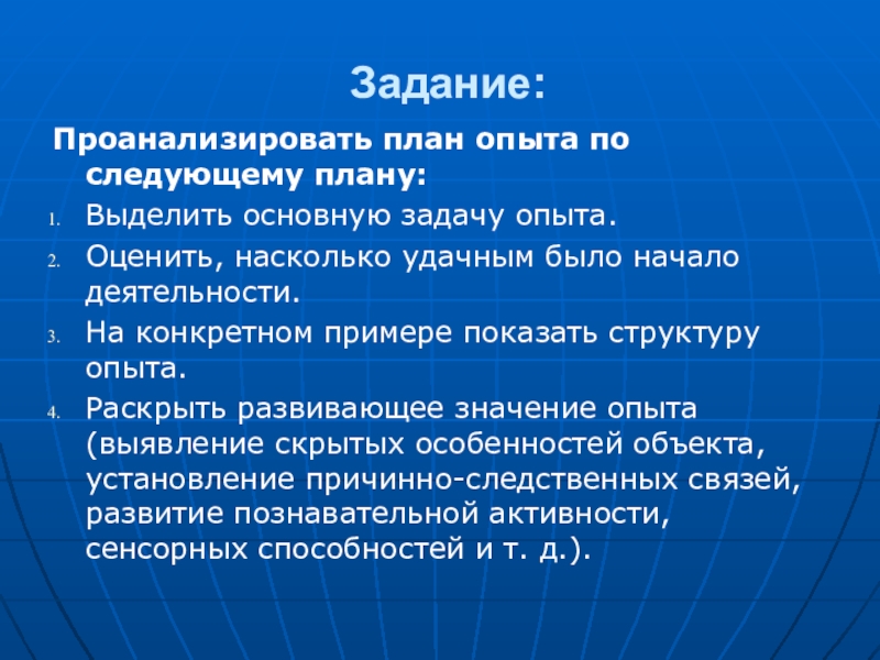 Раскрыть развивающее значение опыта (выявление скрытых особенностей объекта, установление причинно-следственных связей, развитие познавательной активности, сенсорных способностей и т. д.).