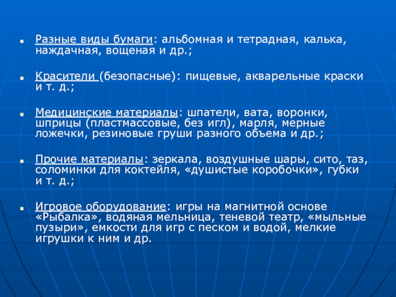 Разные виды бумаги: альбомная и тетрадная, калька, наждачная, вощеная и др.;