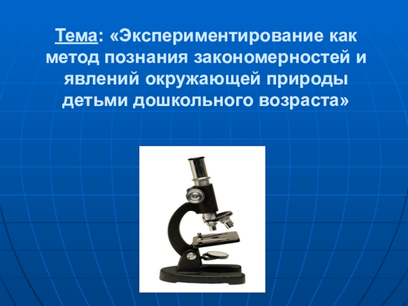 Слайд 1Тема: «Экспериментирование как метод познания закономерностей и явлений окружающей природы детьми