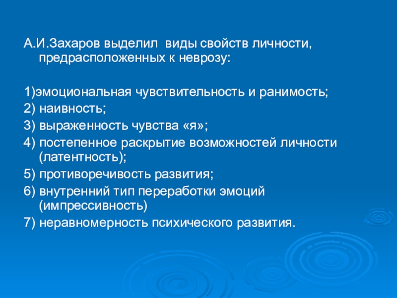 Слайд 14А.И.Захаров выделил виды свойств личности, предрасположенных к неврозу: