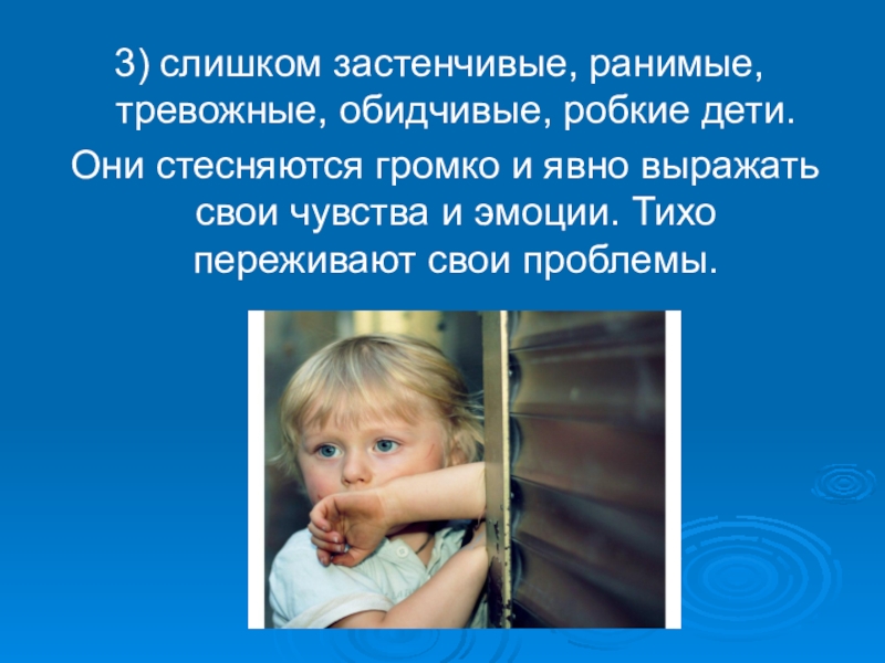 Слайд 243) слишком застенчивые, ранимые, тревожные, обидчивые, робкие дети.