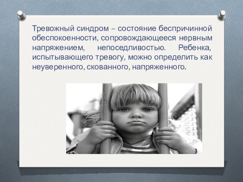Слайд 8Тревожный синдром – состояние беспричинной обеспокоенности, сопровождающееся нервным напряжением, непоседливостью. Ребенка,