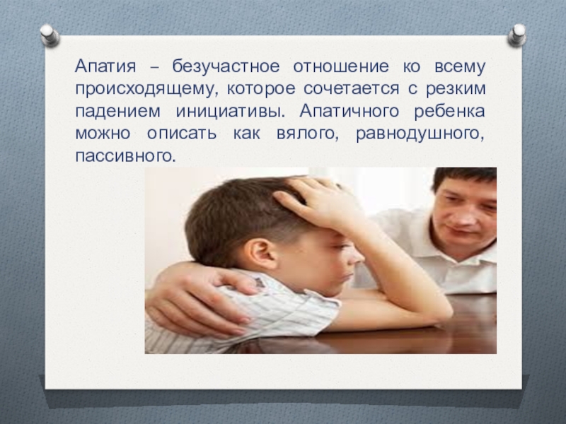 Слайд 10Апатия – безучастное отношение ко всему происходящему, которое сочетается с резким