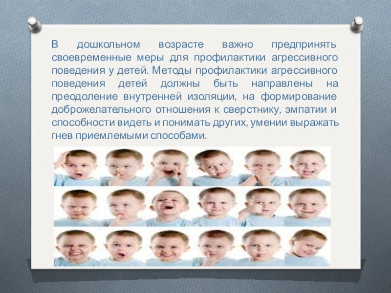 у детей. Методы профилактики агрессивного поведения детей должны быть направлены на преодоление внутренней изоляции, на формирование доброжелательного отношения к сверстнику, эмпатии и способности видеть и понимать других, умении выражать гнев приемлемыми способами.