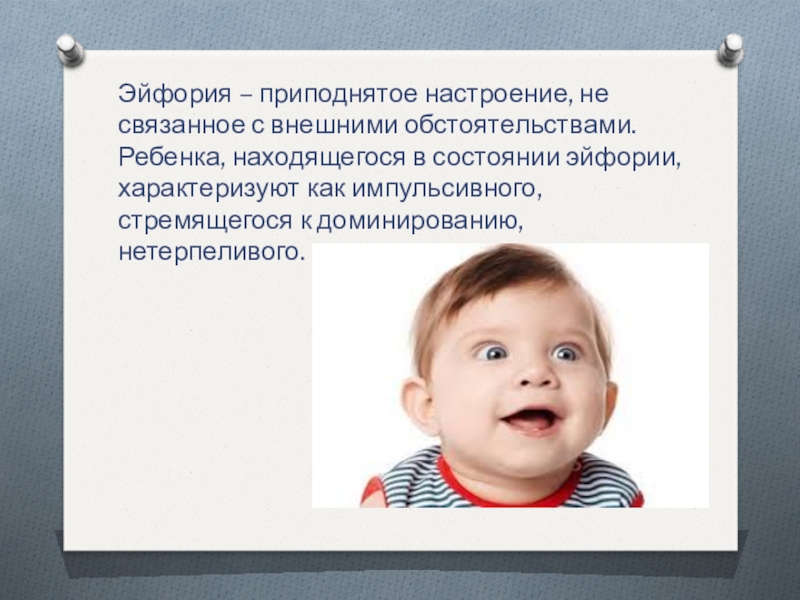 Слайд 5Эйфория – приподнятое настроение, не связанное с внешними обстоятельствами. Ребенка, находящегося