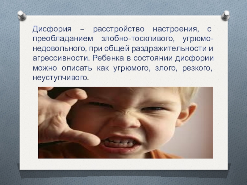 и агрессивности. Ребенка в состоянии дисфории можно описать как угрюмого, злого, резкого, неуступчивого.