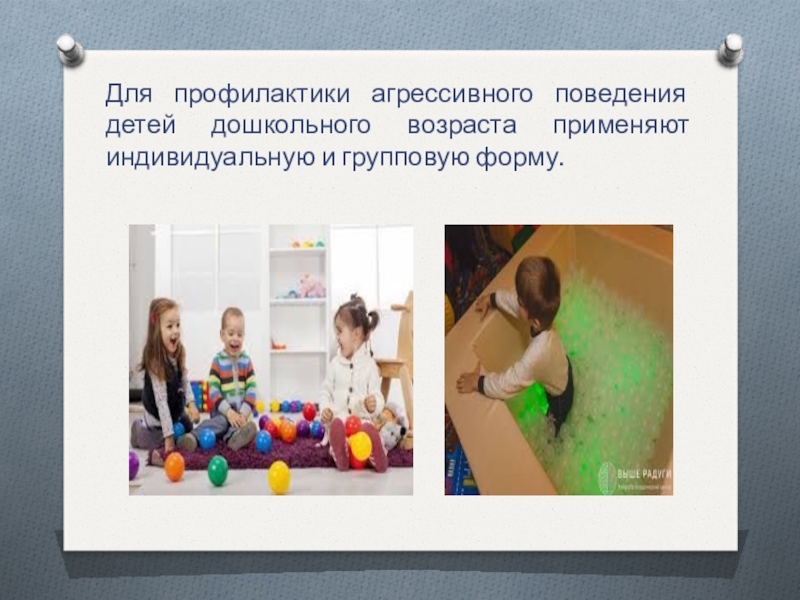 Слайд 30Для профилактики агрессивного поведения детей дошкольного возраста применяют индивидуальную и групповую