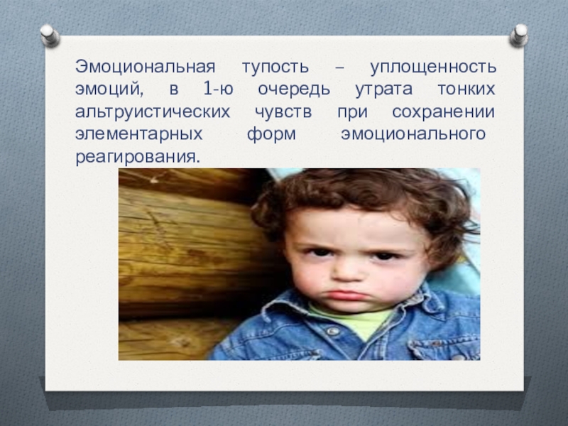 Слайд 11Эмоциональная тупость – уплощенность эмоций, в 1-ю очередь утрата тонких альтруистических