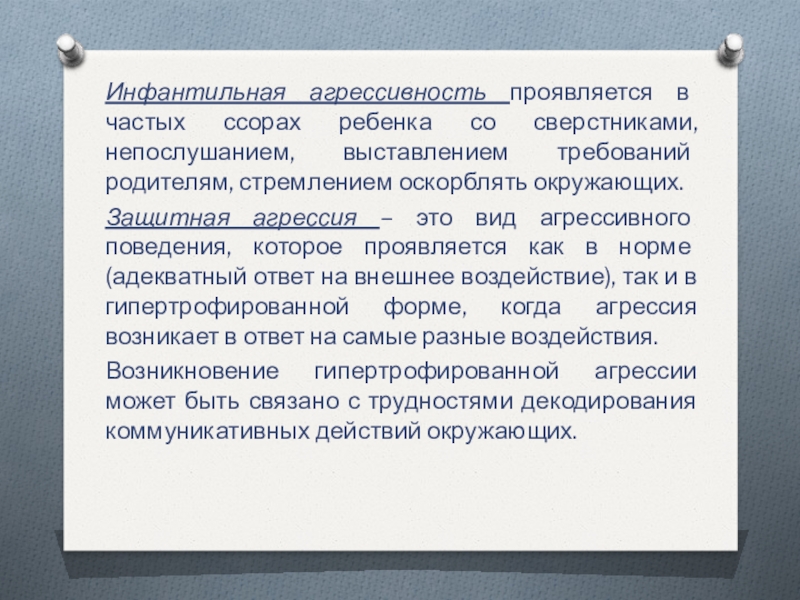 Слайд 16Инфантильная агрессивность проявляется в частых ссорах ребенка со сверстниками, непослушанием, выставлением