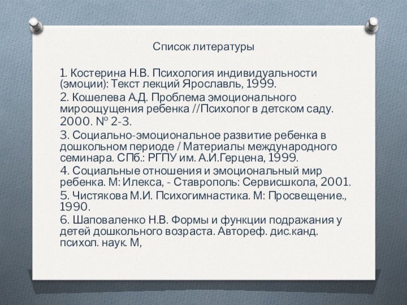 1. Костерина Н.В. Психология индивидуальности (эмоции): Текст лекций Ярославль, 1999.