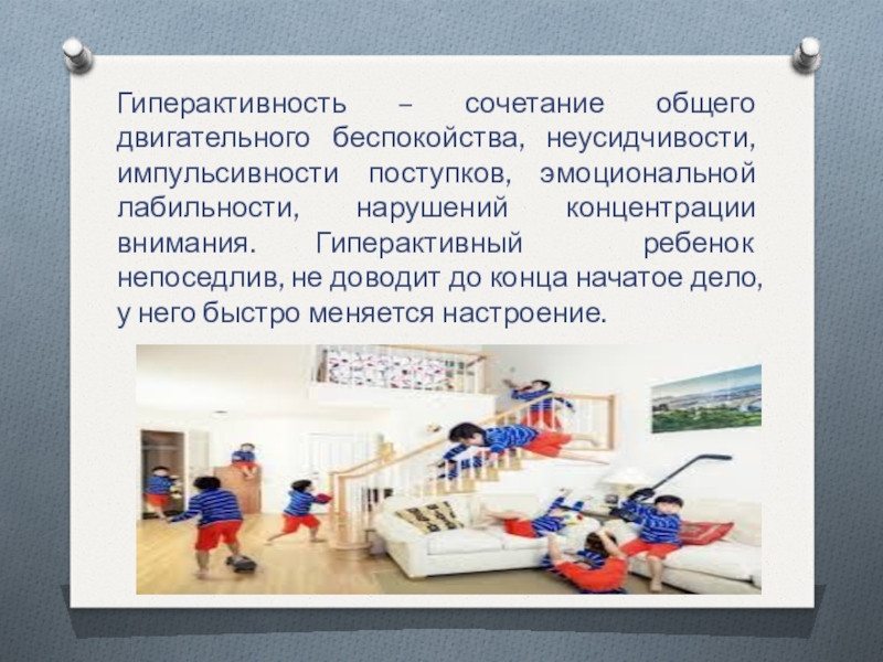 Слайд 14Гиперактивность – сочетание общего двигательного беспокойства, неусидчивости, импульсивности поступков, эмоциональной лабильности,