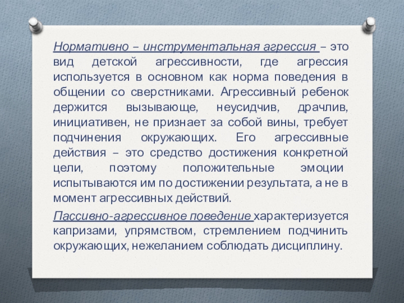 Слайд 15Нормативно – инструментальная агрессия – это вид детской агрессивности, где агрессия