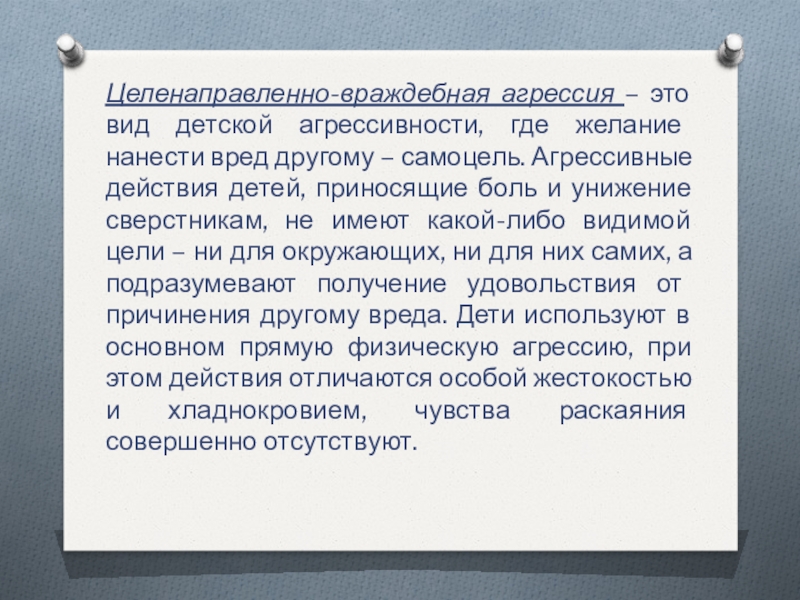 Слайд 18Целенаправленно-враждебная агрессия – это вид детской агрессивности, где желание нанести вред