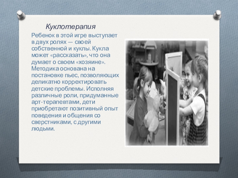 двух ролях — своей собственной и куклы. Кукла может «рассказать», что она думает о своем «хозяине». Методика основана на постановке пьес, позволяющих деликатно корректировать детские проблемы. Исполняя различные роли, придуманные арт-терапевтами, дети приобретают позитивный опыт поведения и общения со сверстниками, с другими людьми.