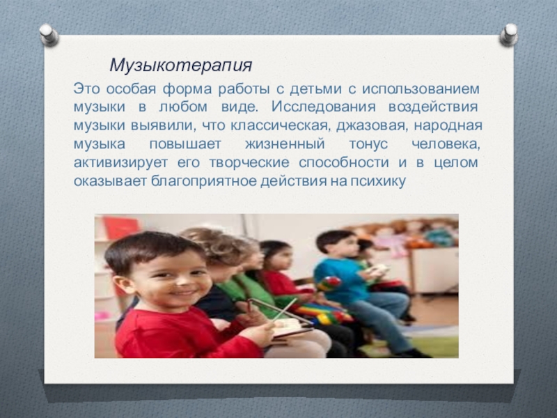 с использованием музыки в любом виде. Исследования воздействия музыки выявили, что классическая, джазовая, народная музыка повышает жизненный тонус человека, активизирует его творческие способности и в целом оказывает благоприятное действия на психику