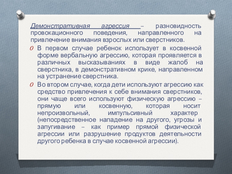 Слайд 17Демонстративная агрессия – разновидность провокационного поведения, направленного на привлечение внимания взрослых