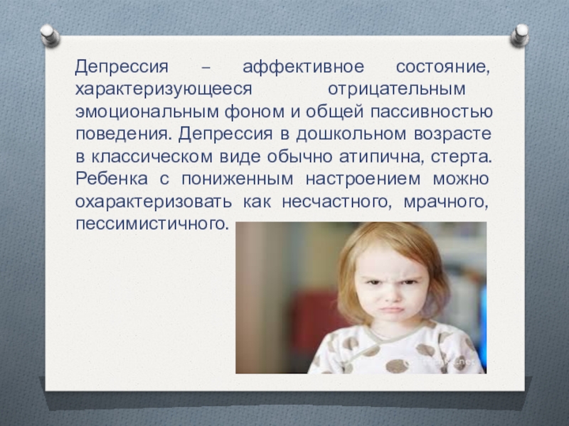 поведения. Депрессия в дошкольном возрасте в классическом виде обычно атипична, стерта. Ребенка с пониженным настроением можно охарактеризовать как несчастного, мрачного, пессимистичного.