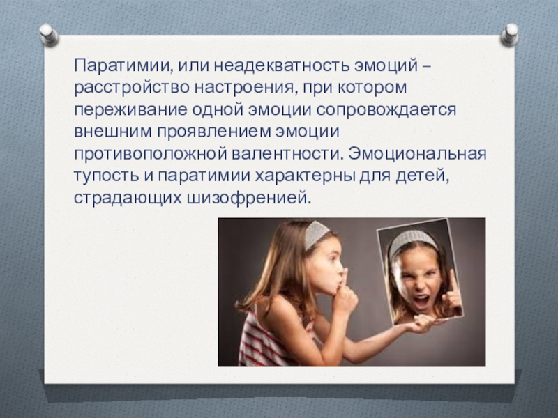эмоции сопровождается внешним проявлением эмоции противоположной валентности. Эмоциональная тупость и паратимии характерны для детей, страдающих шизофренией.