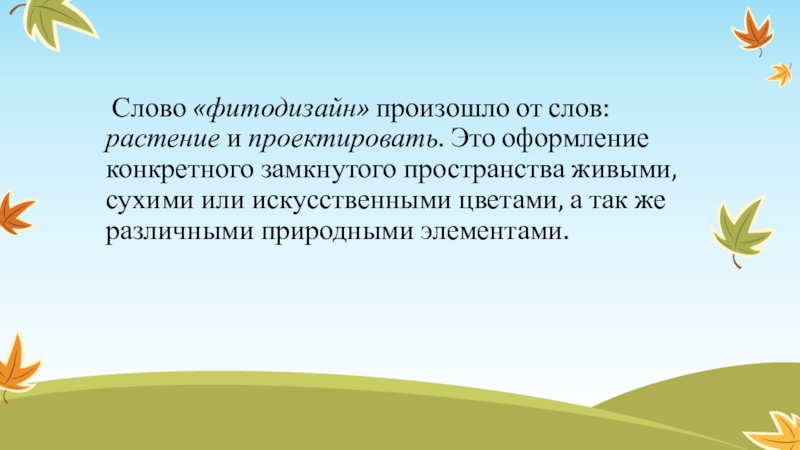 Слайд 3 Слово «фитодизайн» произошло от слов: растение и проектировать. Это оформление