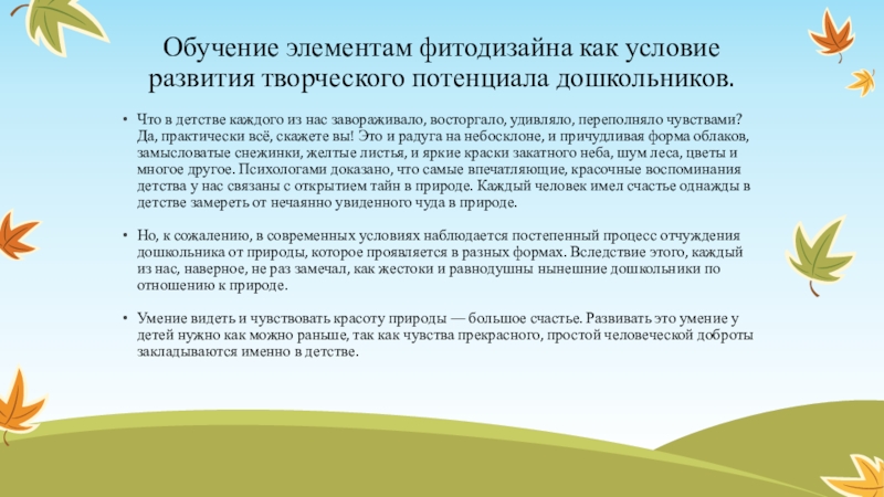 Слайд 2Обучение элементам фитодизайна как условие развития творческого потенциала дошкольников.