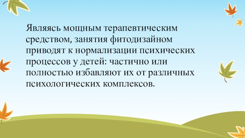 Слайд 8Являясь мощным терапевтическим средством, занятия фитодизайном приводят к нормализации психических процессов