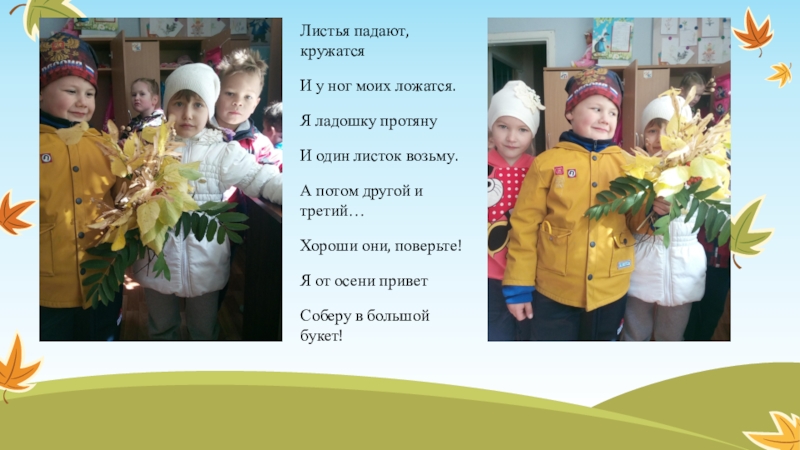Листья падают, кружатсяИ у ног моих ложатся.Я ладошку протянуИ один листок возьму.А потом другой и третий…Хороши они,