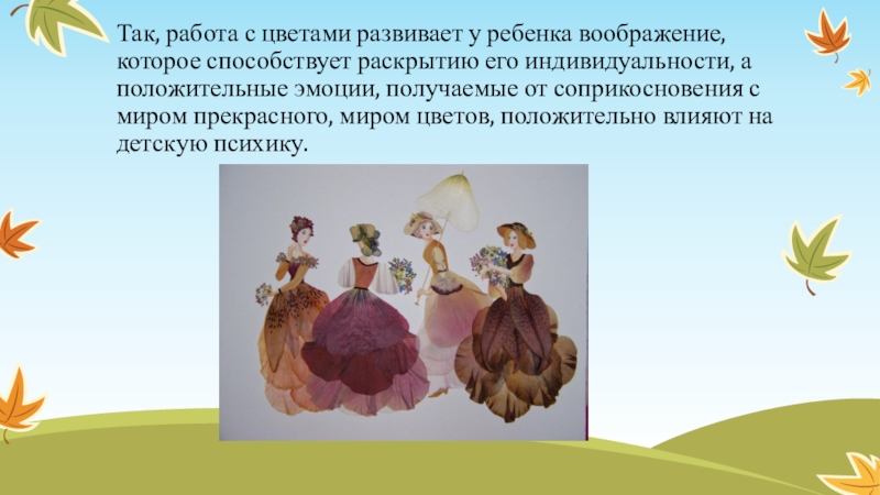 Слайд 9Так, работа с цветами развивает у ребенка воображение, которое способствует раскрытию