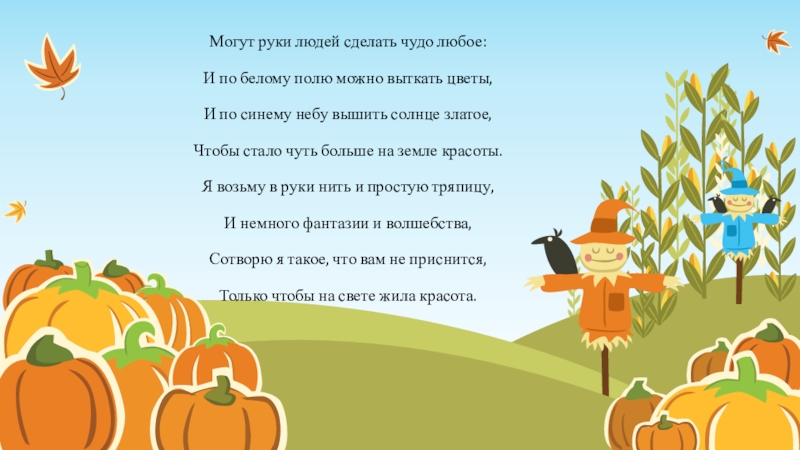 Слайд 10Могут руки людей сделать чудо любое: И по белому полю можно выткать