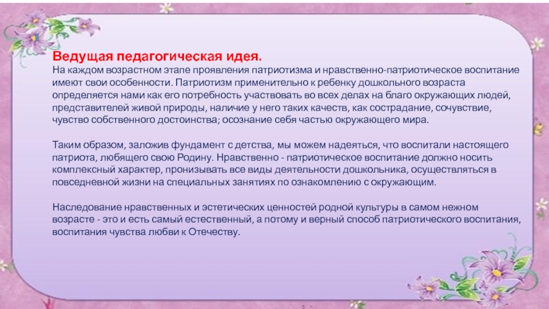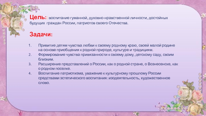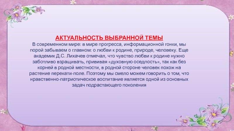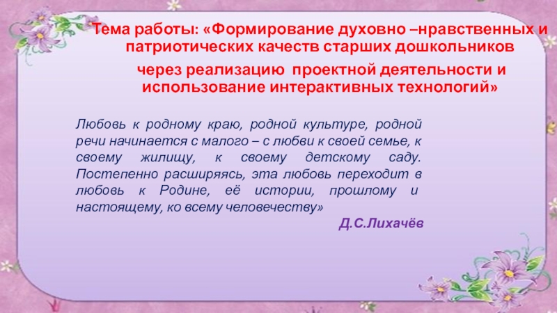 Любовь к родному краю, родной культуре, родной речи начинается с малого – с любви к своей семье, к своему жилищу, к своему детскому саду. Постепенно расширяясь, эта любовь переходит в любовь к Родине, её истории, прошлому и настоящему, ко всему человечеству»