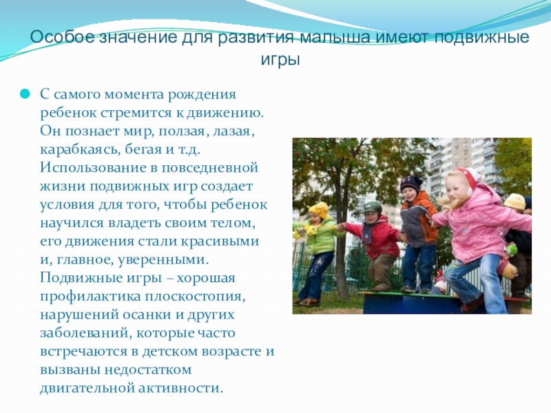 Слайд 15Особое значение для развития малыша имеют подвижные игры