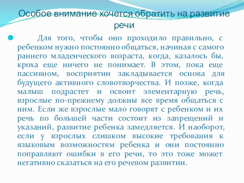 оно проходило правильно, с ребенком нужно постоянно общаться, начиная с самого раннего младенческого возраста, когда, казалось бы, кроха еще ничего не понимает. В этом, пока еще пассивном, восприятии закладывается основа для будущего активного словотворчества. И позже, когда малыш подрастет и освоит элементарную речь, взрослые по-прежнему должны все время общаться с ним. Если же взрослые мало говорят с ребенком и их речь по большей части состоит из запрещений и указаний, развитие ребенка замедляется. И наоборот, если у взрослых слишком высокие требования к языковым возможностям ребенка и они постоянно поправляют ошибки в его речи, то это тоже может негативно сказаться на его речевом развитии.