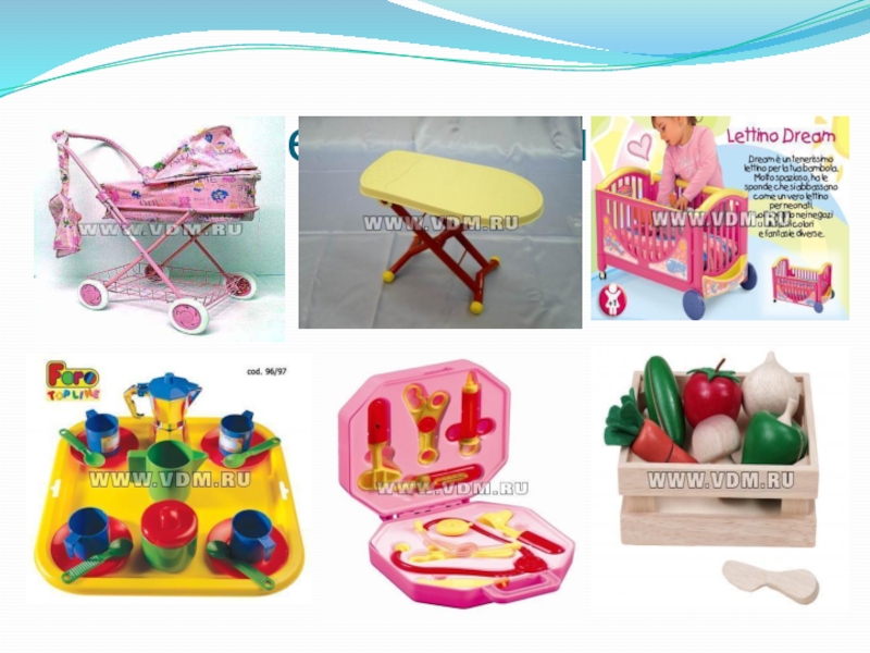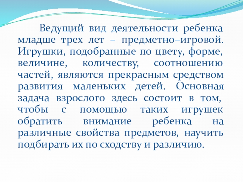 – предметно–игровой. Игрушки, подобранные по цвету, форме, величине, количеству, соотношению частей, являются прекрасным средством развития маленьких детей. Основная задача взрослого здесь состоит в том, чтобы с помощью таких игрушек обратить внимание ребенка на различные свойства предметов, научить подбирать их по сходству и различию.