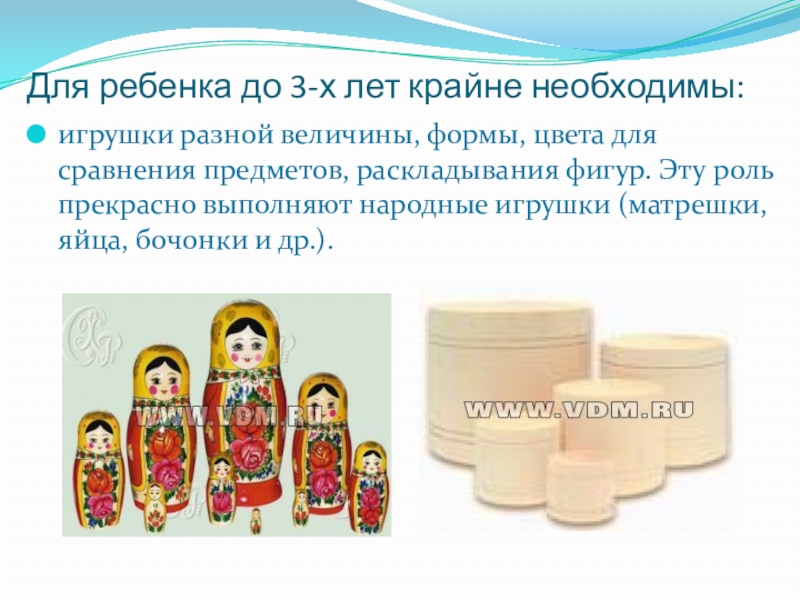 для сравнения предметов, раскладывания фигур. Эту роль прекрасно выполняют народные игрушки (матрешки, яйца, бочонки и др.).
