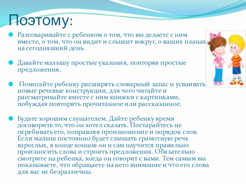 Будьте хорошим слушателем. Дайте ребенку время договорить то, что он хотел сказать. Постарайтесь не перебивать его, поправляя произношение и порядок слов. Если малыш постоянно будет слышать грамотную речь взрослых, в конце концов он и сам научится правильно произносить слова и строить предложения. Обязательно смотрите на ребенка, когда он говорит с вами. Тем самым вы показываете, что обращаете на него внимание и что его слова для вас не безразличны.
