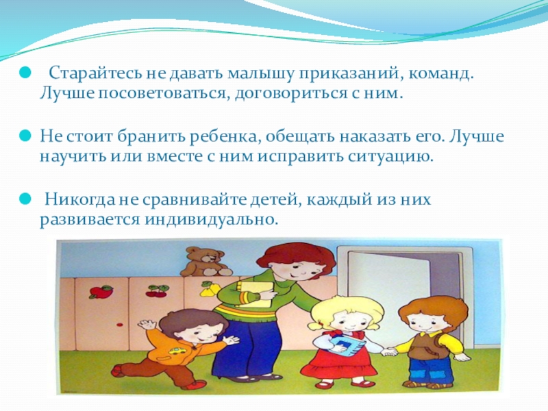Слайд 19 Старайтесь не давать малышу приказаний, команд. Лучше посоветоваться, договориться с