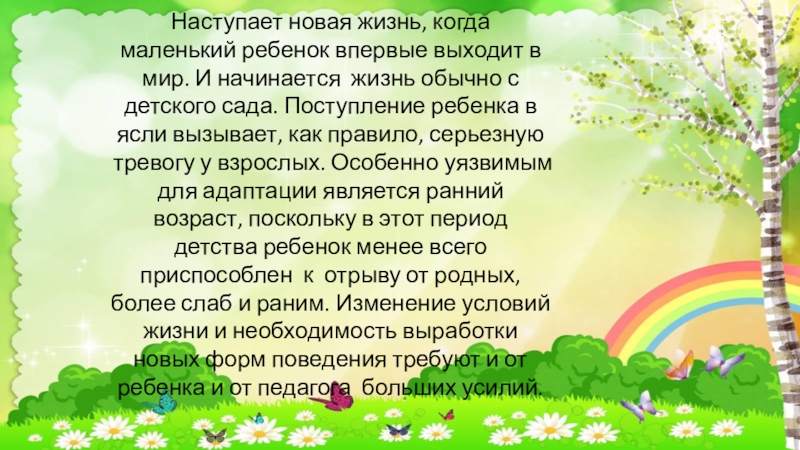 начинается жизнь обычно с детского сада. Поступление ребенка в ясли вызывает, как правило, серьезную тревогу у взрослых. Особенно уязвимым для адаптации является ранний возраст, поскольку в этот период детства ребенок менее всего приспособлен к отрыву от родных, более слаб и раним. Изменение условий жизни и необходимость выработки новых форм поведения требуют и от ребенка и от педагога больших усилий.