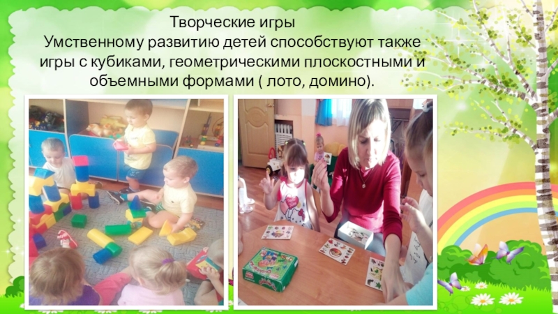 Умственному развитию детей способствуют также игры с кубиками, геометрическими плоскостными