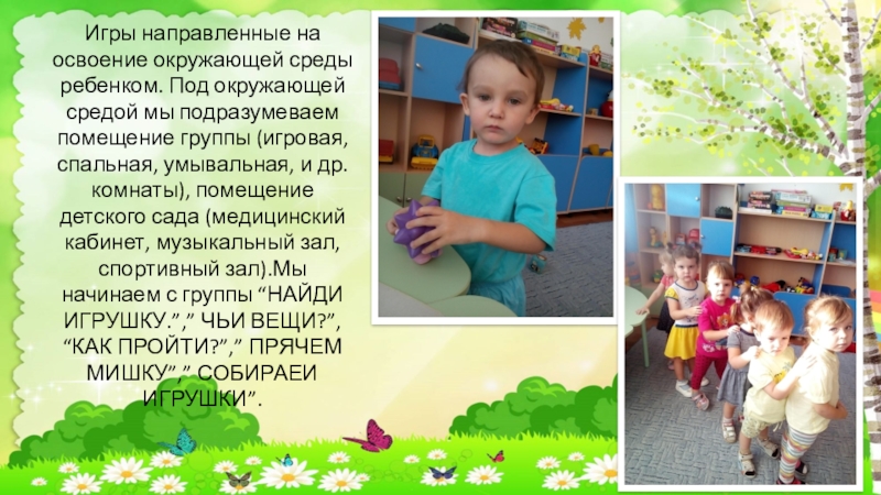 подразумеваем помещение группы (игровая, спальная, умывальная, и др. комнаты), помещение детского сада (медицинский кабинет, музыкальный зал, спортивный зал).Мы начинаем с группы “НАЙДИ ИГРУШКУ.”,” ЧЬИ ВЕЩИ?”, “КАК ПРОЙТИ?”,” ПРЯЧЕМ МИШКУ”,” СОБИРАЕИ ИГРУШКИ”.
