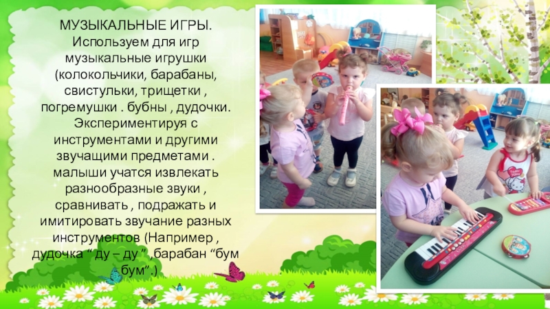 погремушки . бубны , дудочки. Экспериментируя с инструментами и другими звучащими предметами . малыши учатся извлекать разнообразные звуки , сравнивать , подражать и имитировать звучание разных инструментов (Например , дудочка “ ду – ду ” ,барабан “бум - бум”.)