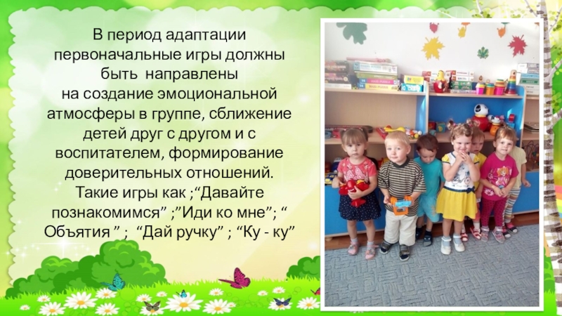 Слайд 7В период адаптации первоначальные игры должны быть направлены