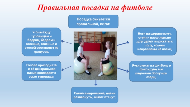 Руки лежат на фитболе и фиксируют его ладонями сбоку или сзади;