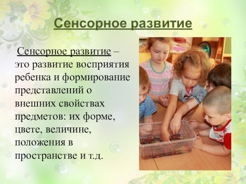 Сенсорное развитие – это развитие восприятия ребенка и формирование представлений о внешних свойствах предметов: их форме, цвете, величине, положения в пространстве и т.д.