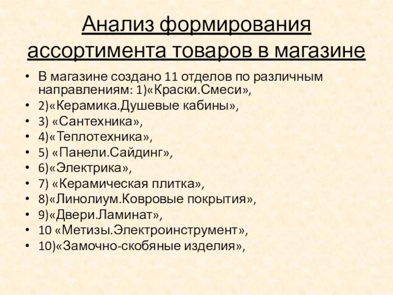 Слайд 9Анализ формирования ассортимента товаров в магазине