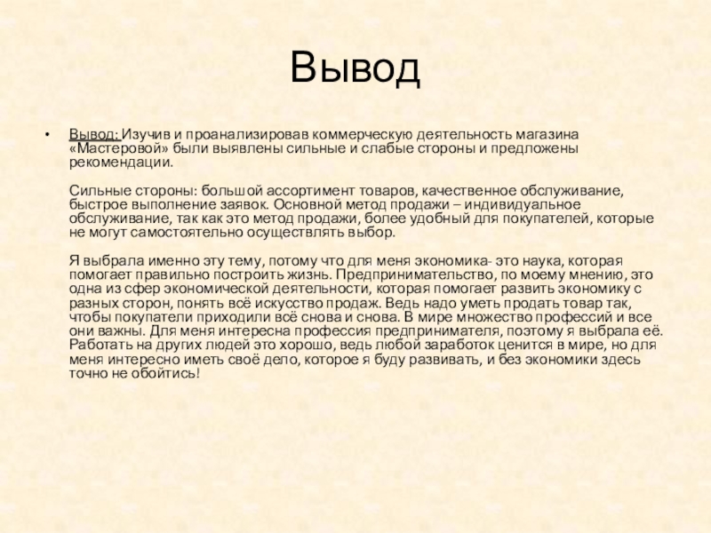 Вывод: Изучив и проанализировав коммерческую деятельность магазина «Мастеровой» были выявлены сильные и
