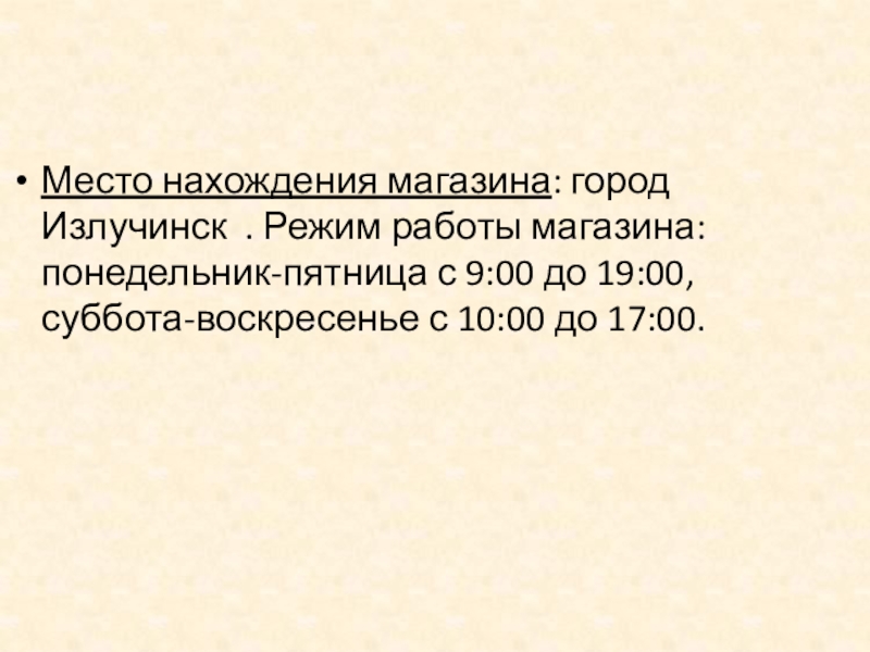 Слайд 7Место нахождения магазина: город Излучинск . Режим работы магазина: понедельник-пятница с
