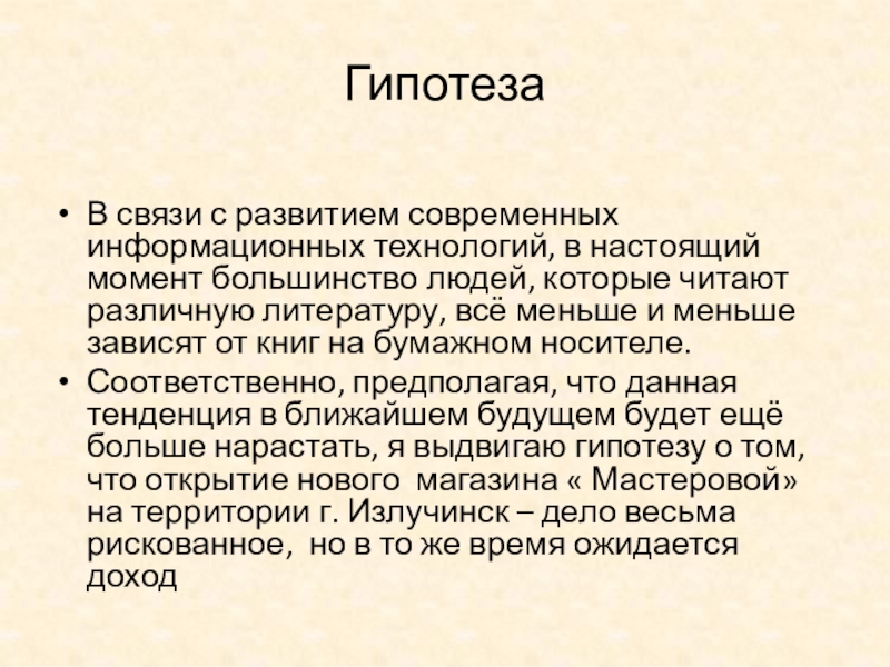 Соответственно, предполагая, что данная тенденция в ближайшем будущем будет ещё больше нарастать, я выдвигаю гипотезу о том, что открытие нового магазина « Мастеровой» на территории г. Излучинск – дело весьма рискованное, но в то же время ожидается доход